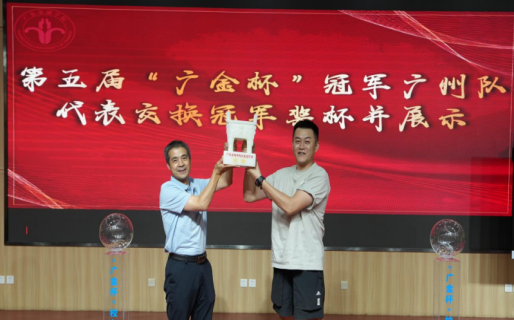 (第五届“广金杯”校友足球邀请赛冠军广州队代表、校友工作办公室主任赖志成共同展示冠军奖杯)